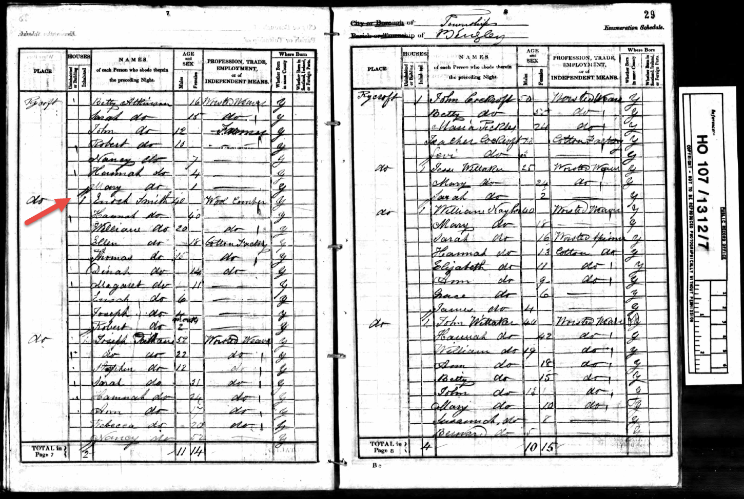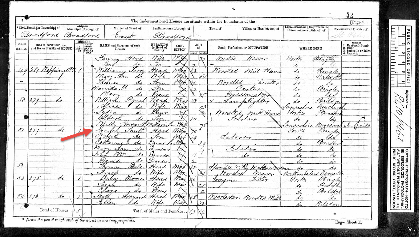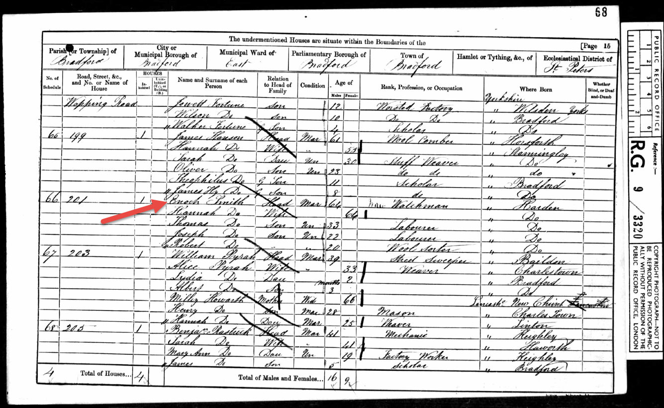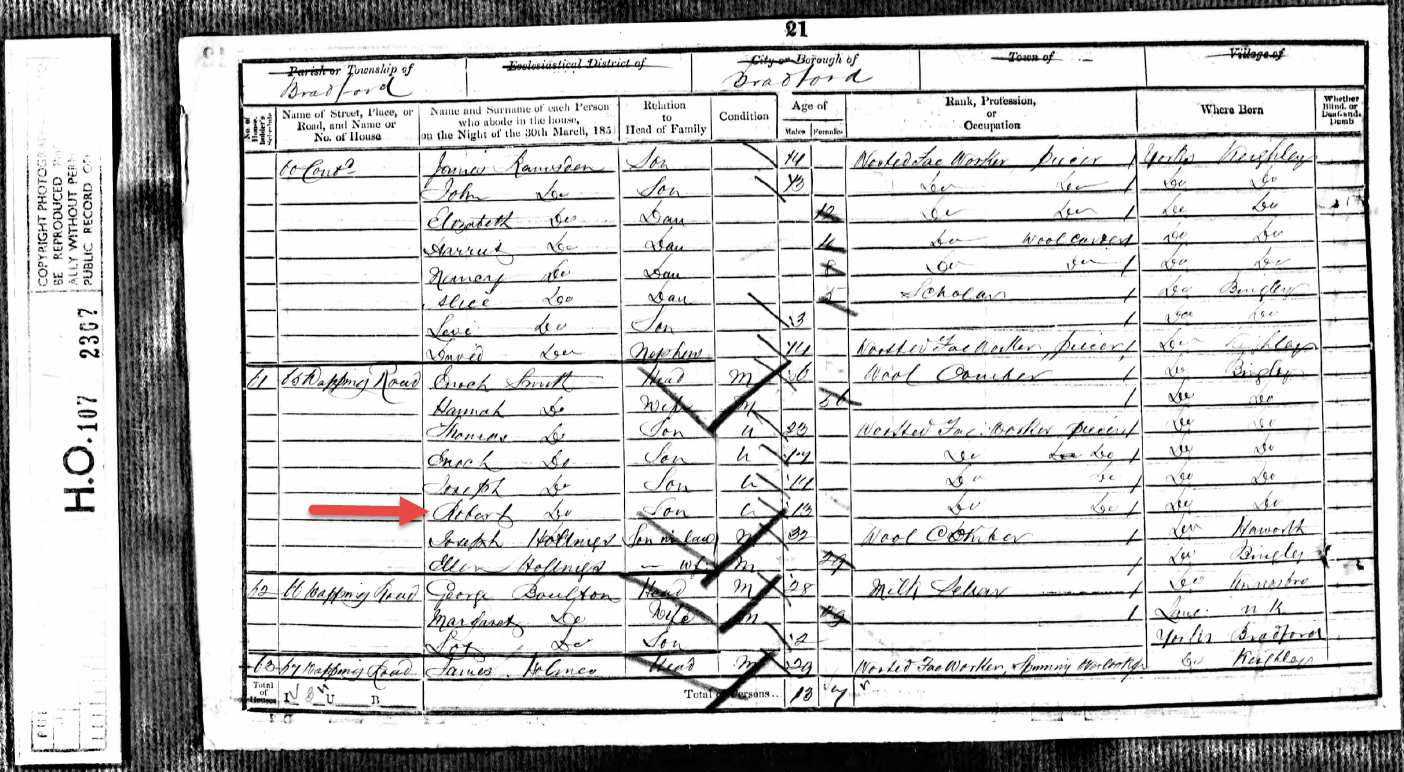 The 1851 census has Enoch and his family living on Wapping Road in Bradford with four children living at home–Thomas, age 23; Enoch, 17; Joseph, 14; and Robert, 13. Also living with the family are Enoch and Hannah’s daughter Ellen and her husband, Joseph Hollings. Enoch, the father, and Joseph Hollings, the son-in-law, report their occupations as “wool comber.” The four sons, including the two youngest, Joseph and Robert, are working in the “worsted factory.”