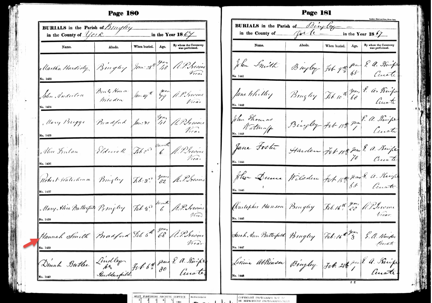 At the time of the 1841 census, Enoch, aged 40, was living with his family on Rycroft Road in Bingley. In the twenty-one years since their marriage Enoch Smith and Hannah Moore Smith had eight children; William now age 20; Ellen, 18; Thomas, 15; Dinah,14; Margaret,11; Enoch, 6; Joseph, 4; and Robert, age 2 months. It is Robert, my great grandfather, who will, forty years later, bring his family to America. Enoch’s occupation was wool comber as was his son William’s. Daughters Ellen and Dinah and son Thomas listed their occupations as “cotton factory.”