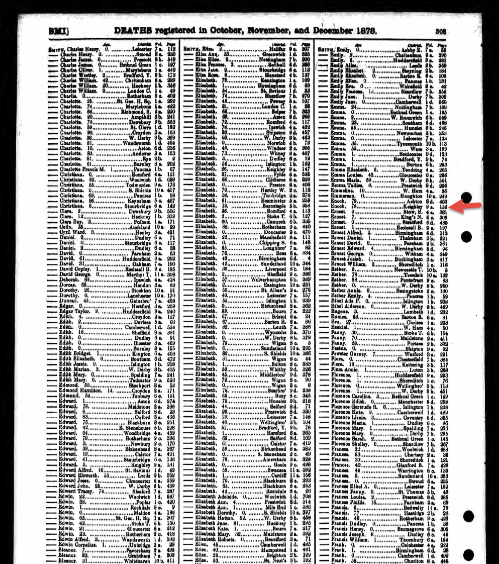 In 1861 the census finds Enoch and Hannah still on Wapping Road with three of their sons living with them. Enoch, now aged 66, reports his occupation as “Night Watchman.” Sons Thomas and Joseph are listed as “Laborers” and the third son, Robert, now aged 20, is a “Wool Sorter,” an occupation he will follow in later years in Providence and Bristol, R.I., in the United States.