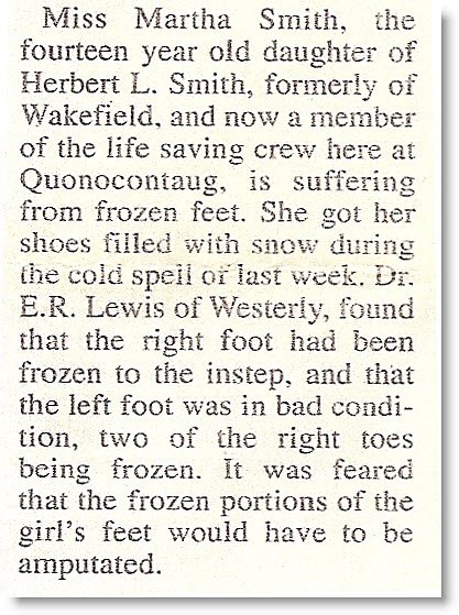 Martha grew up on a farm in Quonochontaug, Rhode Island. She writes about “Papa”, her father, Herbert Levi “Hoke” Smith. Hoke was a member of the US Life Saving Service. She also writes about “Mamma”, her mother Anne, and “Grandma”, her grandmother Sarah Dorcas Oatley Smith.