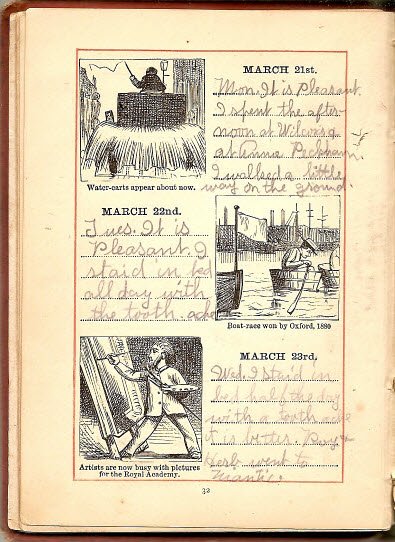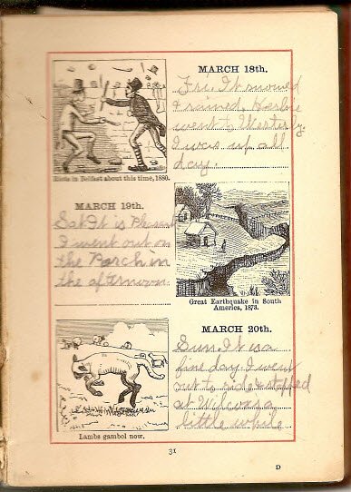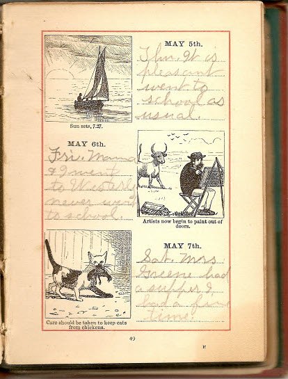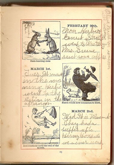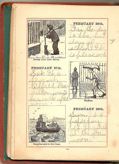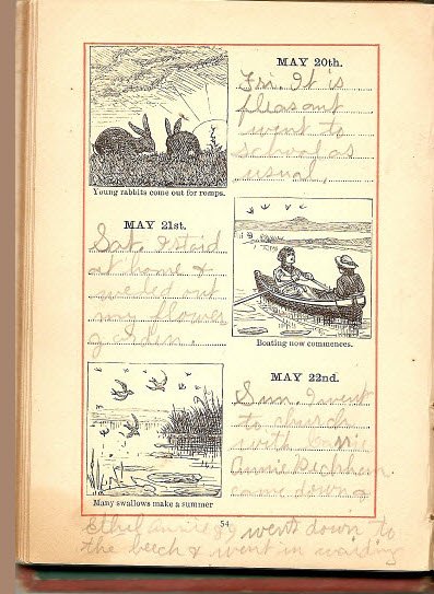 The diary entries contain the names of her friends and neighbors who come to visit while Martha is confined to bed, and afterwards, when she is up and around and back to school. Several of these friends and Martha’s sisters, Ethel and Sarah (Sadie), and her brother Roy are in this photo of the Quonochontaug School children taken before Sadie’s death in 1903: