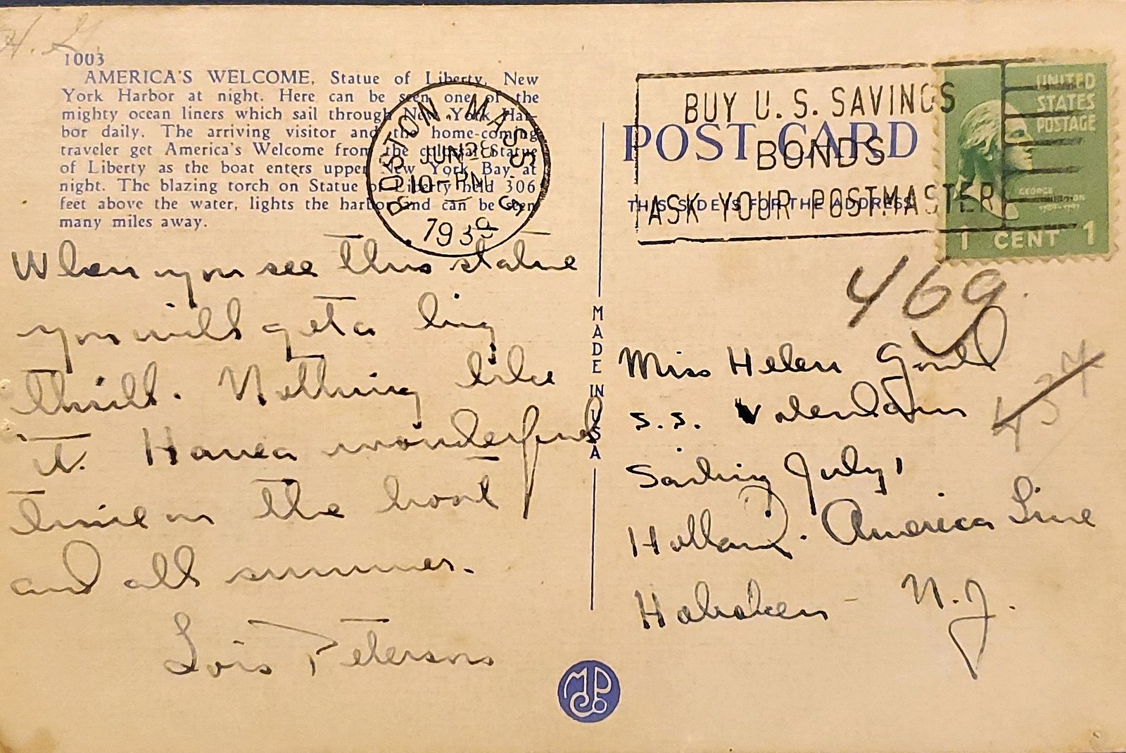 July 1, 1939 (Saturday) Departing Hoboken/New York area